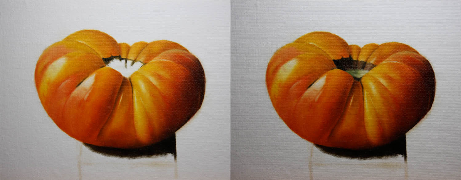 Then I added the smaller forms I used titanium white, yellow ochre pale, cadmium yellow light, cadmium deep red, cadmium red, cadmium orange, and burnt sienna. You can see the smaller forms work better when the bigger form is established and the light is correct. Then I started on the second pastry approaching it the same way as I did with the first, adding the local colors and worrying about modeling the bigger forms.